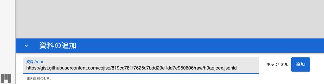 { "@context": "http://iiif.io/api/presentation/3/context.json", "type": "Manifest", "id": "https://gist.githubusercontent.com/cojiso/819cc781f7625c7bdd29e1dd7e950606/raw/h9aojeex.jsonld", "label": "Bun Cha Gio", "items": [{ "id": "https://w3id.org/py6soghg/iiif/h9aojeex/canvas/p1", "type": "Canvas", "height": 3024, "width": 3024, "items": [{ "id": "https://w3id.org/py6soghg/iiif/h9aojeex/page/p1", "type": "AnnotationPage", "items": [{ "id": "https://w3id.org/py6soghg/iiif/h9aojeex/annotation/p1-image", "type": "Annotation", "motivation": "painting", "body": { "id": "https://gist.github.com/user-attachments/assets/a2ca17da-fda1-44dd-bc62-5045beada76a", "type": "Image", "format": "image/jpeg" }, "target": "https://w3id.org/py6soghg/iiif/h9aojeex/canvas/p1" }] }] }]}- 以下の画像で示す位置にあるURLを、手順1-4 で控えたURLに書き換えます