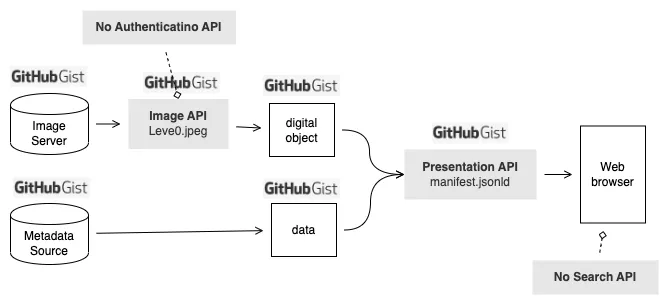 - Image API は level 0 準拠のものを Gist で近似した。より level が高い場合にはタイル画像TIFFをJsonで配信する必要があるが、jpeg画像をそのまま配信するだけでもビューワーによっては表示することができる。3