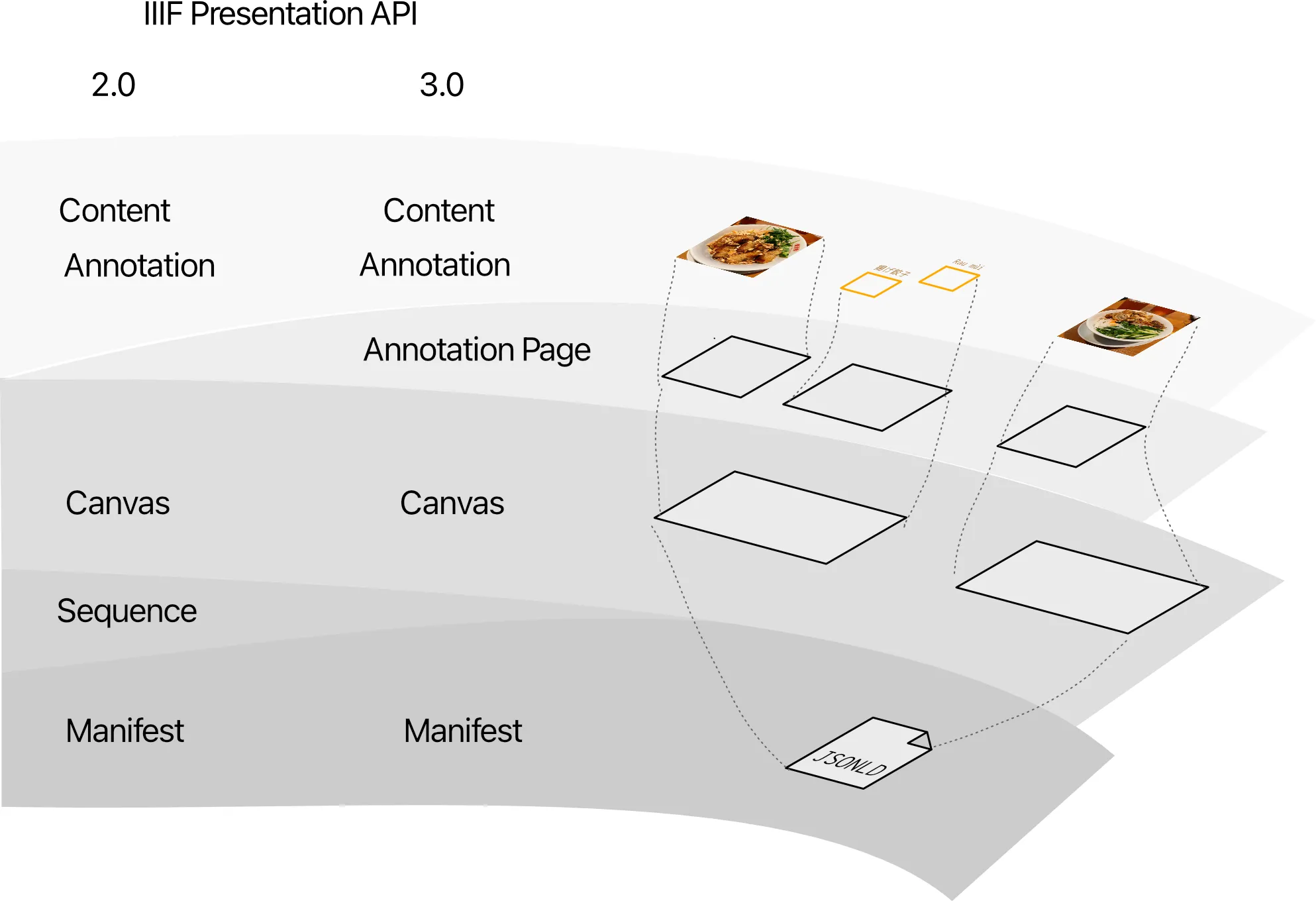 - また、IIIF Presentation API はバージョン2.0から3.0に切り替わる際に、いくつかのプロパティが互換性を失うことを含む、大幅な変更が行われた。5 ビューワーによっては3.0に対応していないものもある。 6